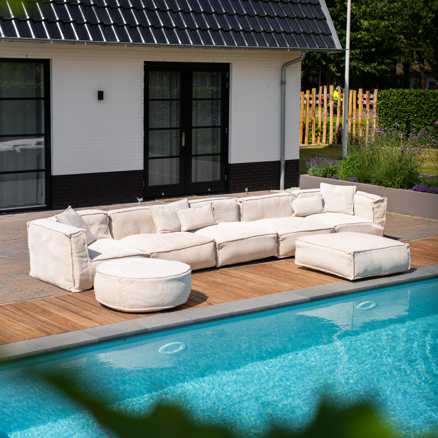 Luxe, handgemaakte Maya Living pouf vierkant in beige. 100% waterdoorlatende stof en vulling van duurzame, gerecyclede EPS-korrels. Geschikt voor in- en outdoor.