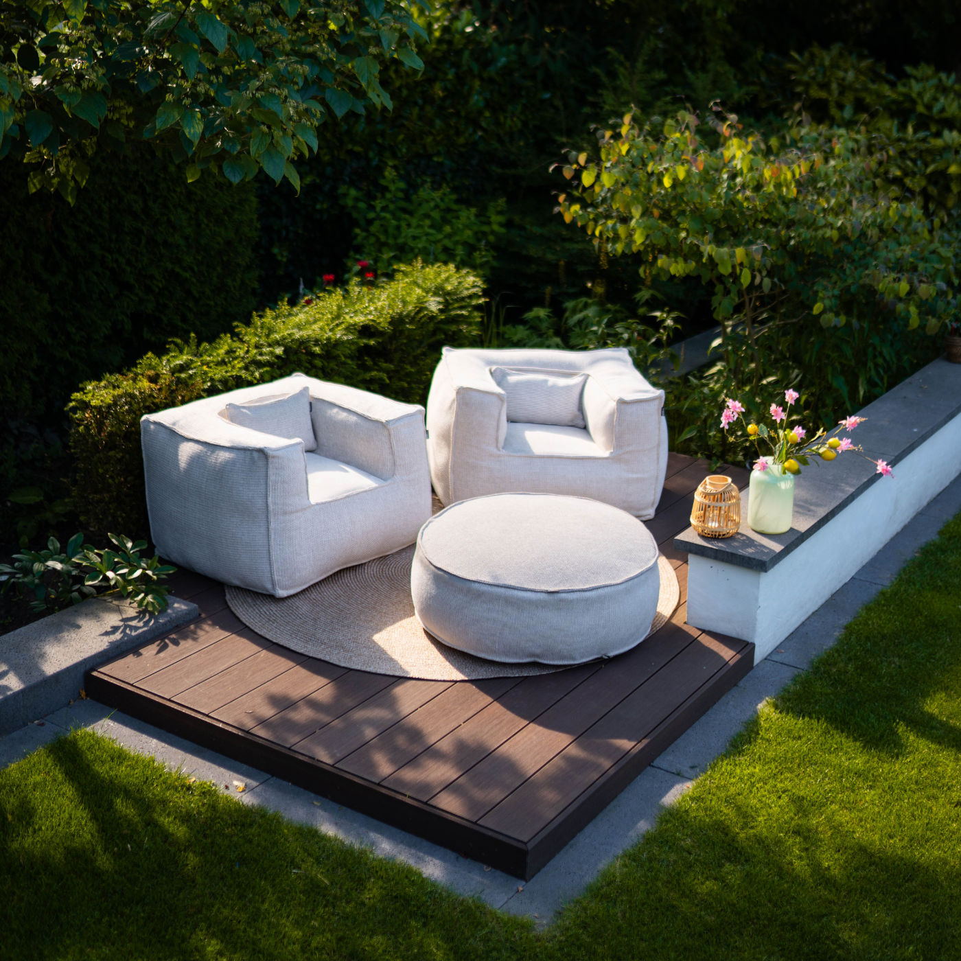 De vulling van de tuinmeubels bestaat uit (gerecyclede) EPS-korrels. Deze hebben de eigenschap om water volledig door te laten en niet te absorberen. Na een flinke regenbui, is jouw tuinset doorgaans binnen een uur weer droog om op te zitten.