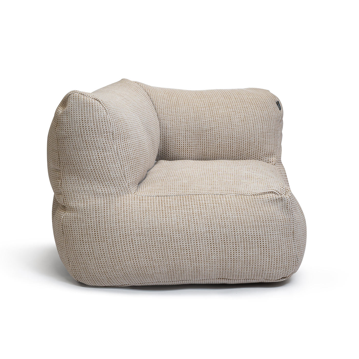 Luxe, handgemaakte Maya Living hoekstoel Zoey in beige. 100% waterdoorlatende stof en vulling van duurzame, gerecyclede EPS-korrels. Geschikt voor in- en outdoor, tegen elke weersomstandigheid.