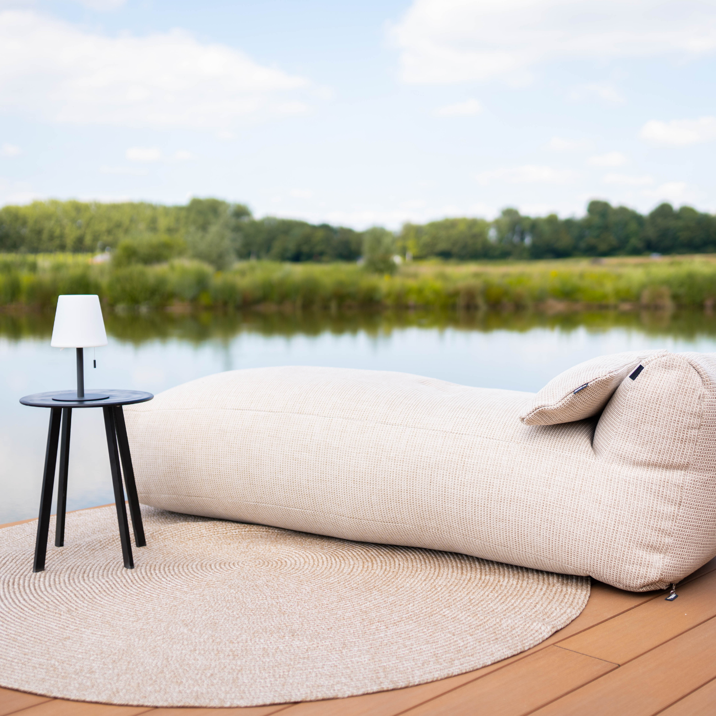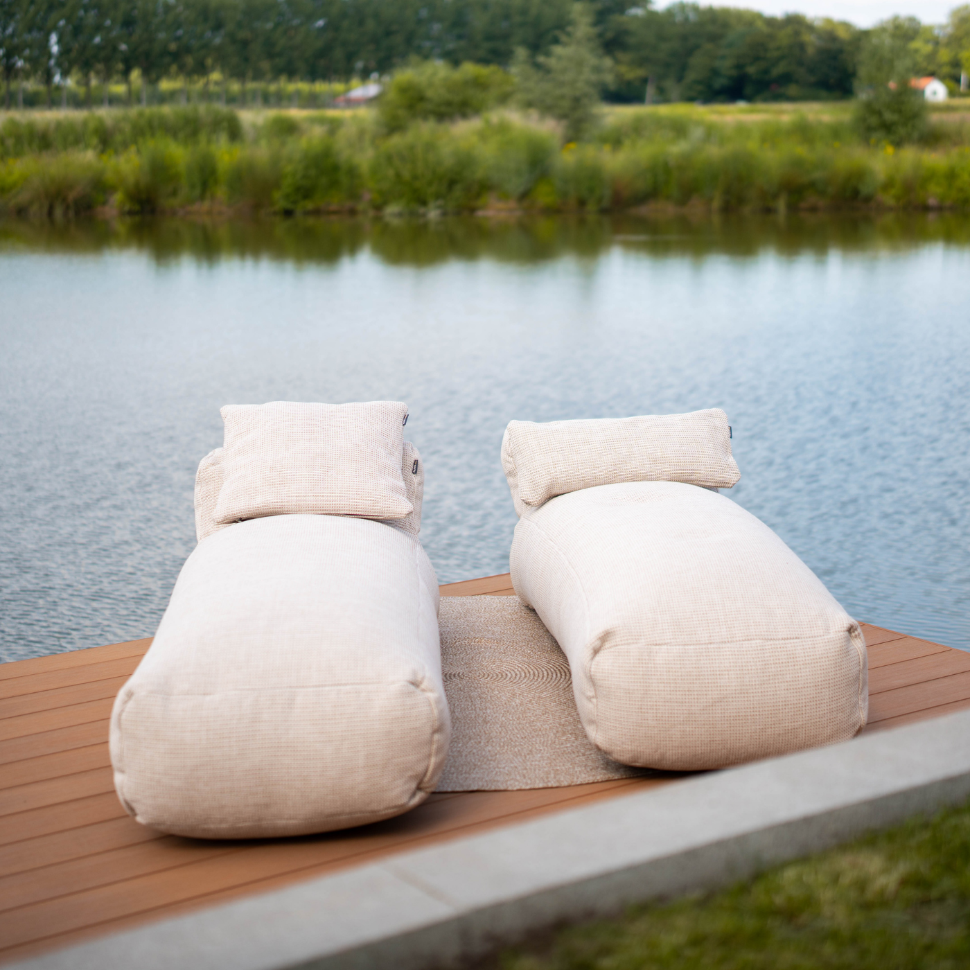 Luxe, handgemaakte Maya Living ligbed Zoey Large in beige. 100% waterdoorlatende stof en vulling van duurzame, gerecyclede EPS-korrels. Geschikt voor in- en outdoor, tegen elke weersomstandigheid.